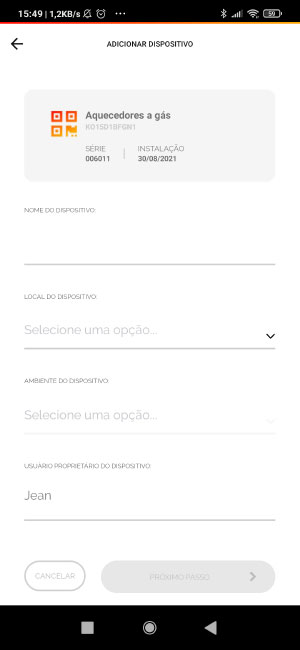4) Digite como você deseja chamar seu Aquecedor, selecione o Local e ambiente que está instalado;