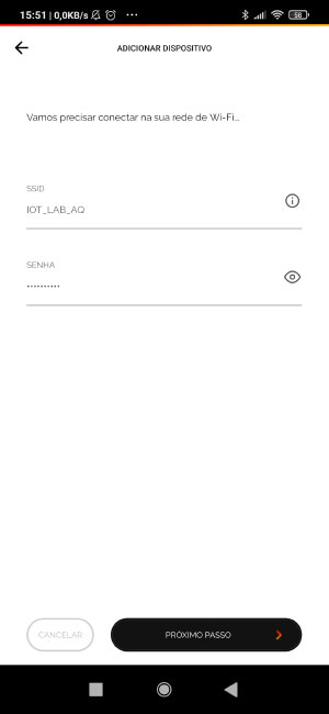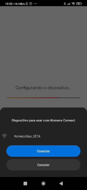 6) Preencha a senha da rede Wi-Fi; Nesse momento o APP fará uma busca pela rede “hostpot”(Wi-Fi) gerada pelo aquecedor. Quando for localizado será apresentado “KomecoGas_XXXX”. Conecte.
